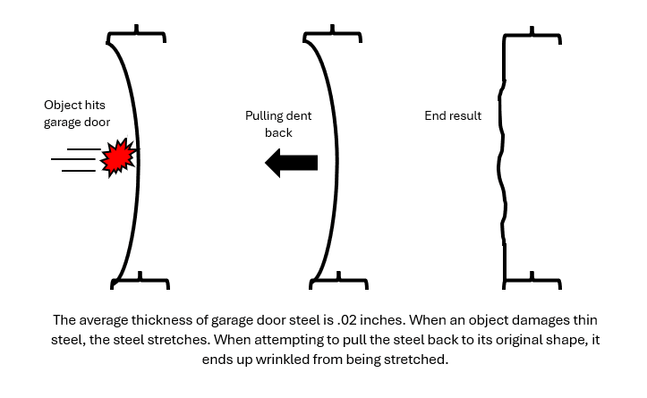 Notice: We do not offer dented garage door repair services. Garage door metal is thin and textured and repairing dents is not guaranteed. Several of these tips are techniques derived from automotive dent repair and could be potential options for DIY repair.